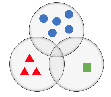 같은 모양과 색을 가진 도형들이 하나씩 있네요. 이 색 또는 모양이 이들을 집합으로 만들어주는 기준이 됩니다.