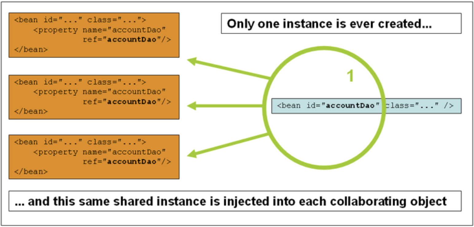 Bean에서 관리하는 인스턴스는 오직 하나이며, 모든 요청은 Spring container가 해당 빈과 매칭되는 인스턴스로 반환 한다.