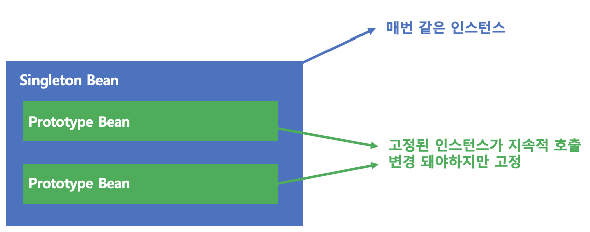 Prototye, Singleton bean을 함께 쓰는 경우가 바로 그러한 상황인데요.