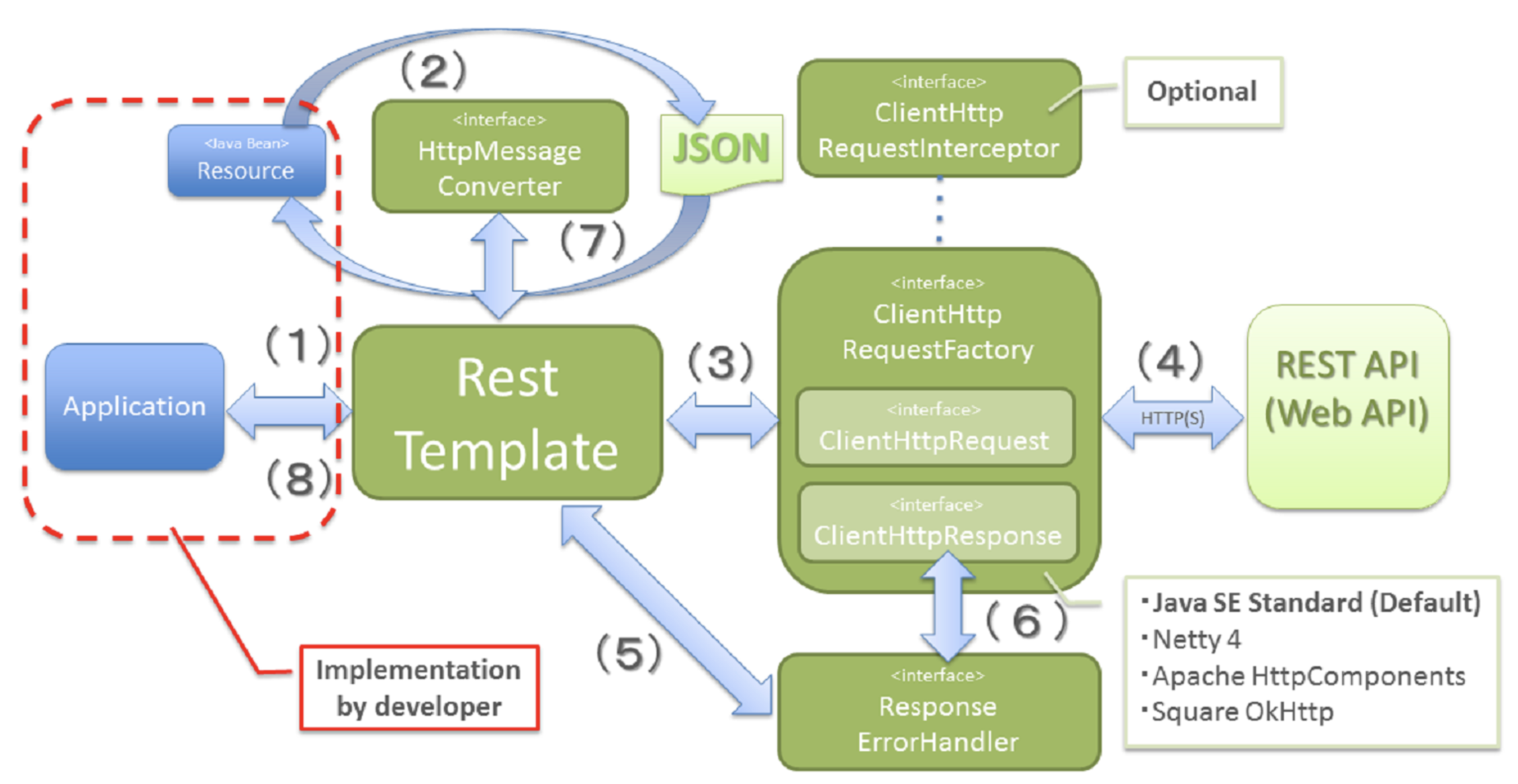 Spring 3.0 이후 http(web).client 패키지에 포함. HTTP 요청을 Json, xml, String 과 같은 응답으로 받을 수 있는 동기식 템플릿 메소드 API. 일반적인 HTTP 메소드 시나리오에 필요한 템플릿 및 부가적인 덜 사용되는 부분에 대한 템플릿도 제공.