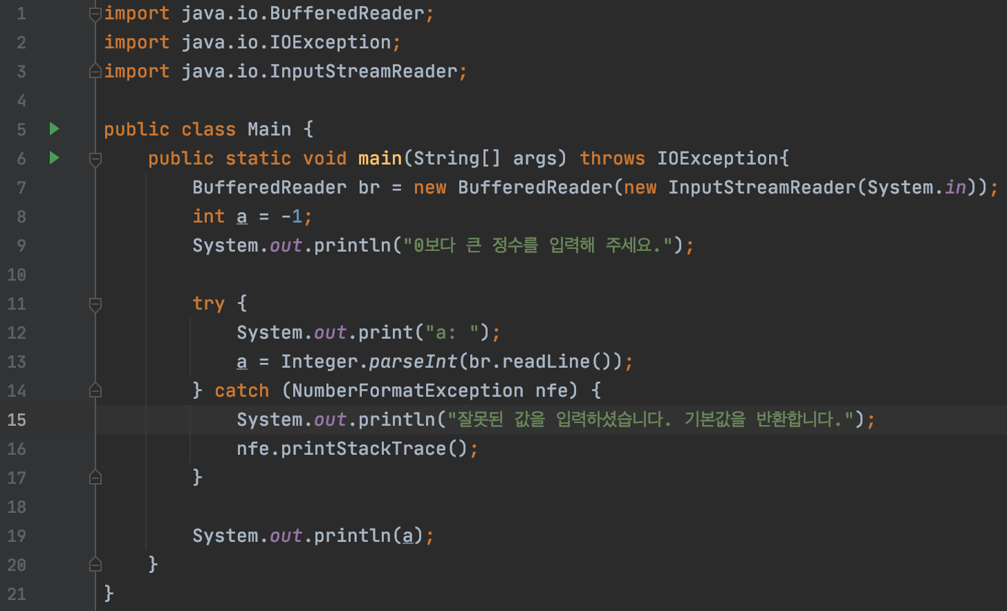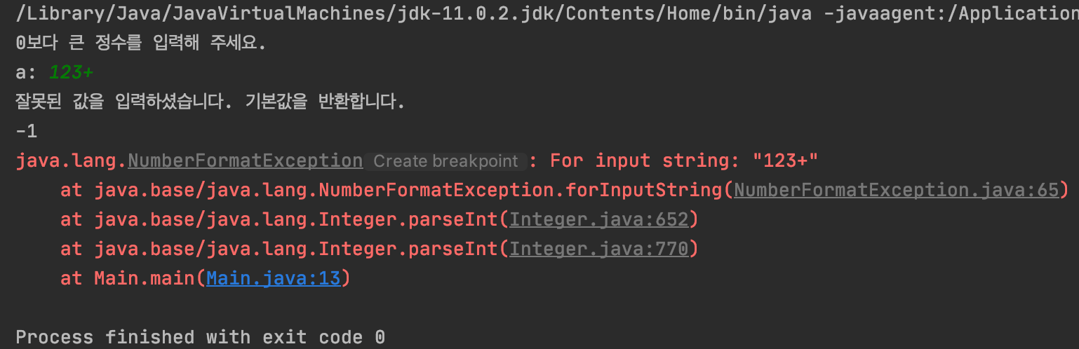 하지만, 정수형 데이터가 아닌 경우엔 아래와 같이 예외가 발생합니다.