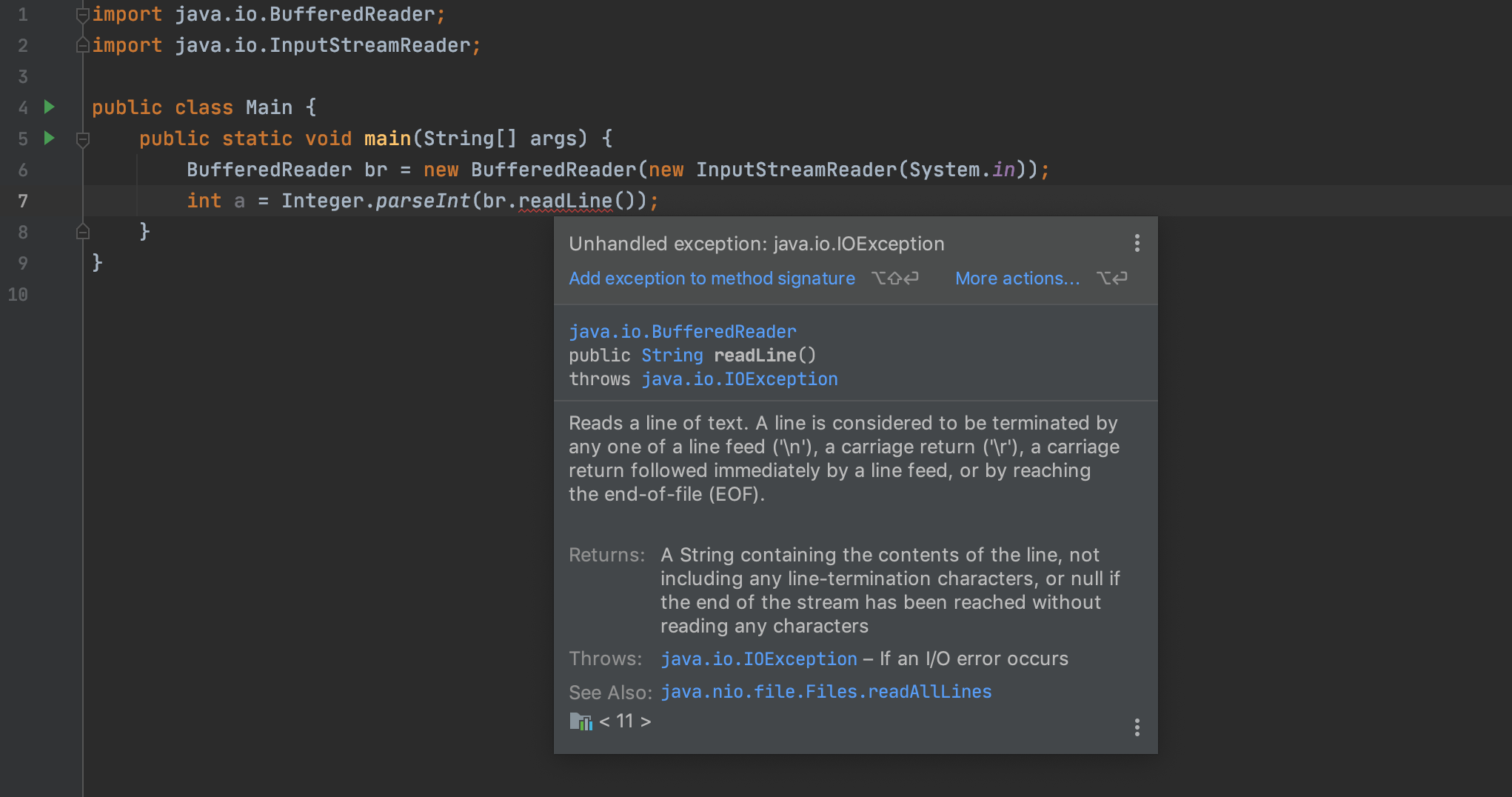 readLine에서 발생하는 IOException에 대한 원인은 해당 링크의 답변을 참고하시기 바랍니다.