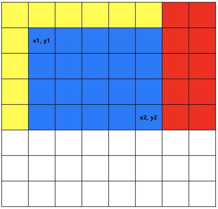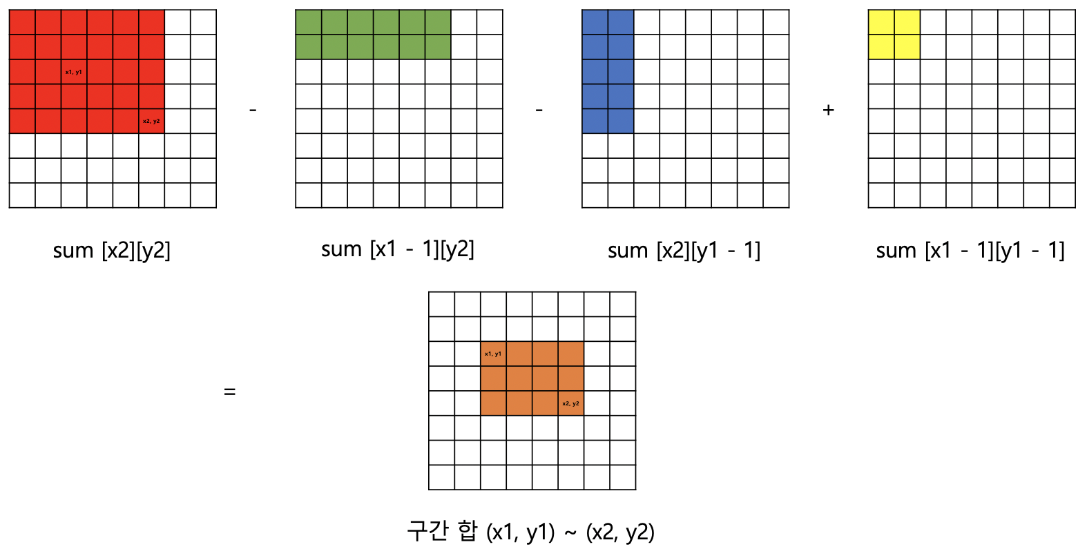 그림 2. 2차원 구조 파악 우선, 전체 색칠한 부분의 sum은 sum[x2][y2]가 되어야 할 겁니다. (파랑 + 노랑)
