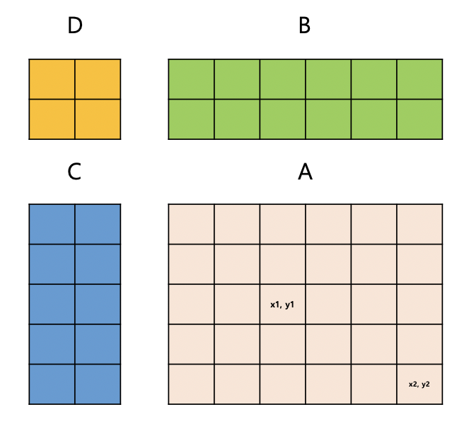 target = sum[x2][y2](A) - sum[x1 - 1][y2](B) - sum[x2][y1 - 1](C) + sum[x1 - 1][y1 - 1](D)