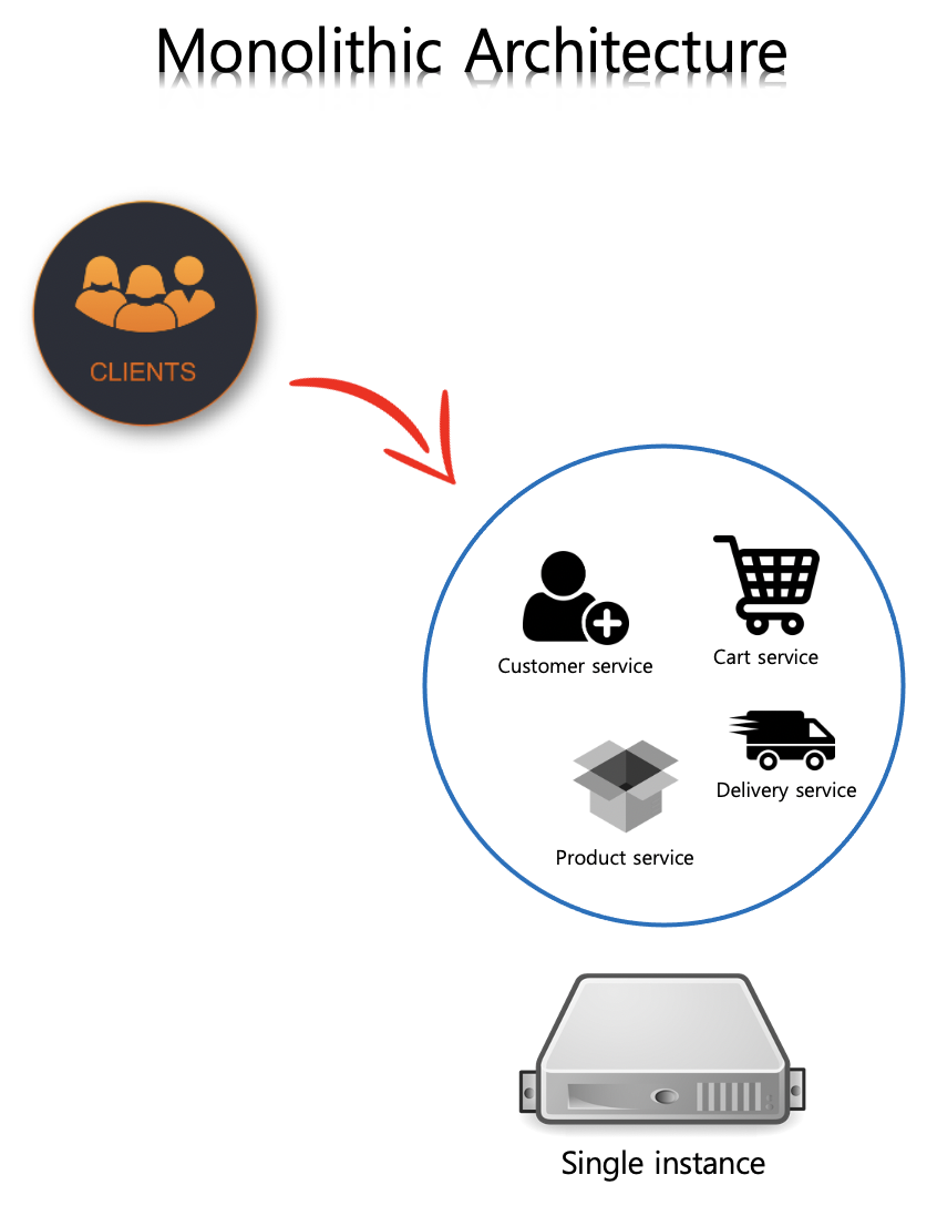 2. 단일체의, 한 덩어리로 뭉친즉, 이제까지 애플리케이션은 하나의 뭉쳐있는 단일체(Monolithic) 서비스로 존재했습니다.