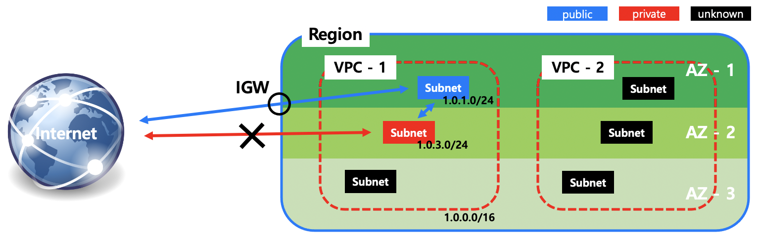 Route Table에 IGW로 가는 Routing rule의 존재 여부로 public/private을 구분할 수 있습니다.