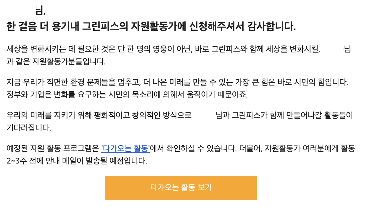 그림 3. 그린피스 봉사활동 지원 2 자원봉사 그 정도일 뿐인데, 생각보다 용기가 필요했습니다..ㅠㅠ