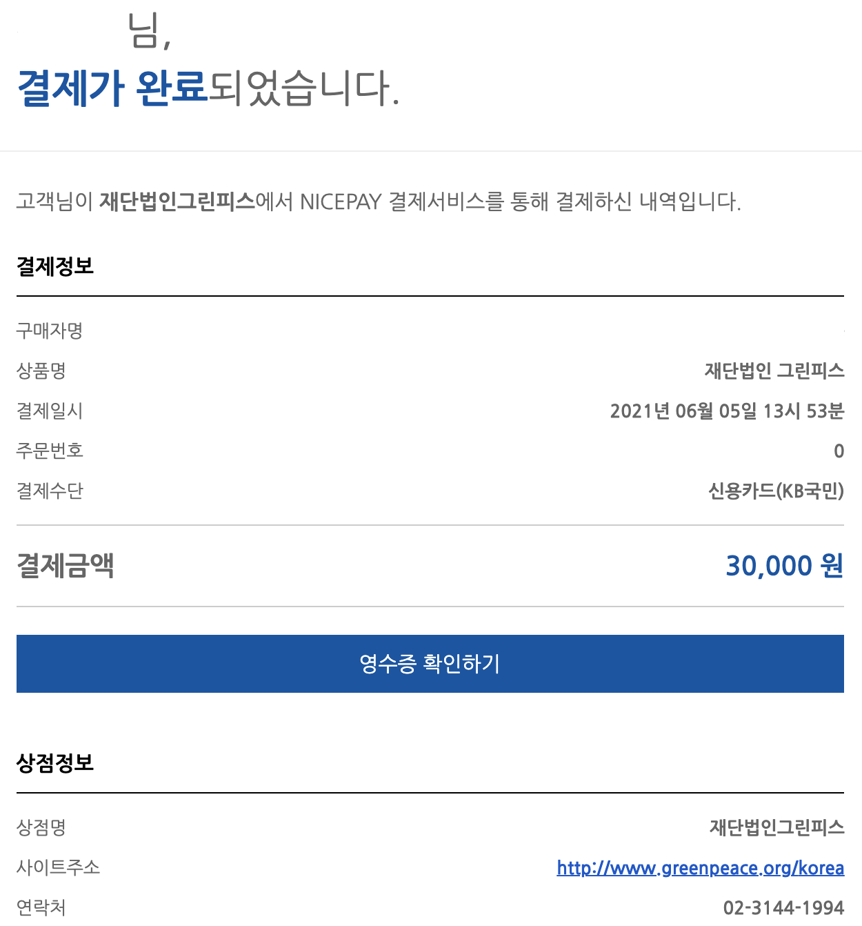 그림 2. 그린피스 봉사활동 지원 1 비록 이번엔 최소 금액이지만 지속적 참여에 의의를 두고, 취직하면 좀 더 금액을 올려 후원해 볼 생각입니다.