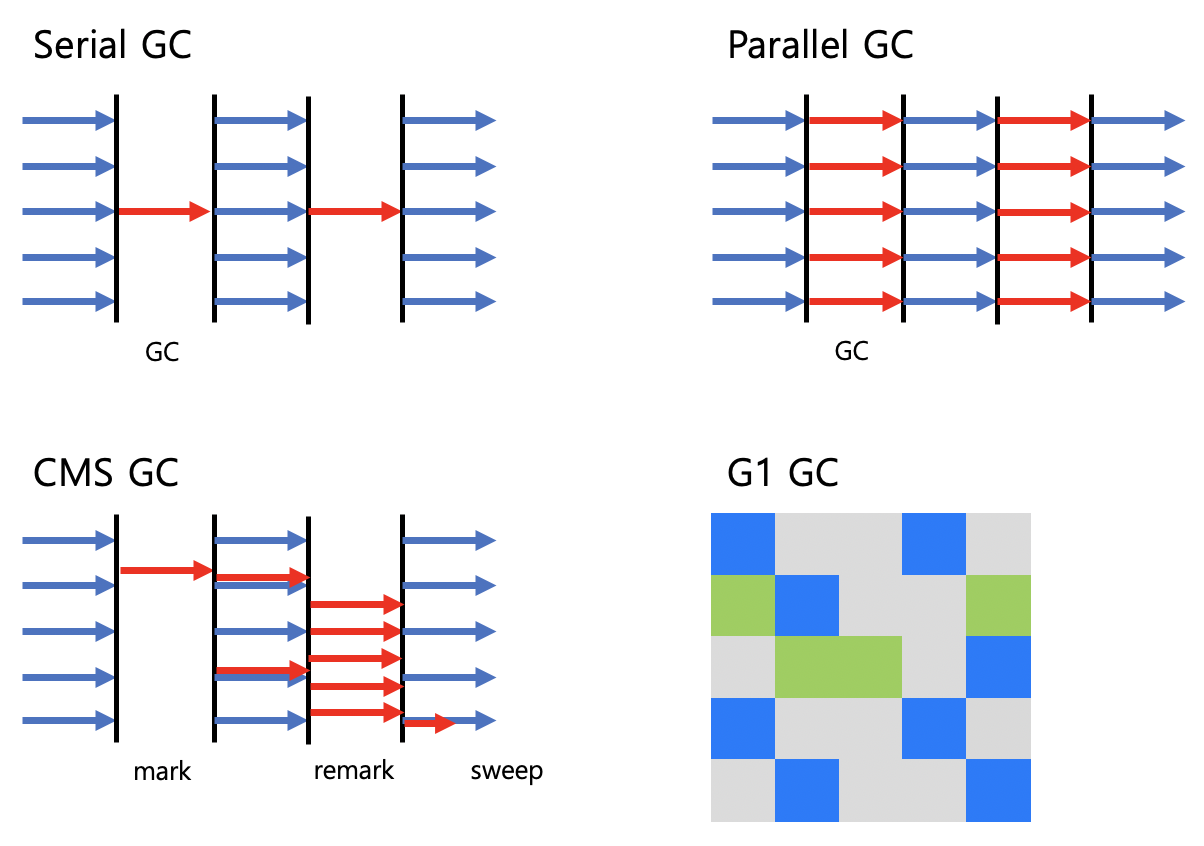 각 GC의 특징을 그림으로 표현하면 아래와 같습니다.