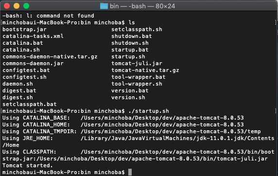 ex) cd ~/본인 지정 경로/apache-tomcat-8.0.53/bin/