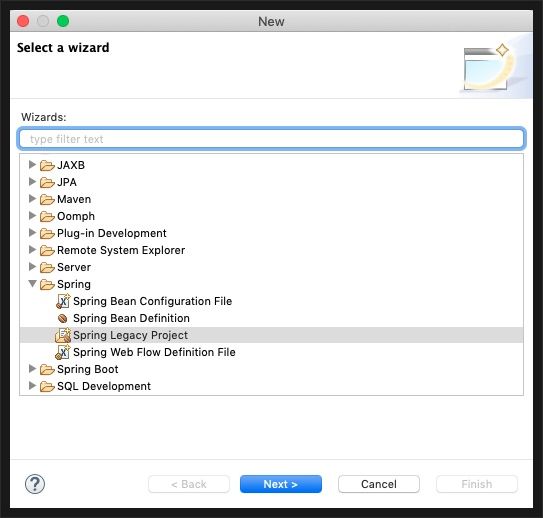 File -> New -> other를 선택하면 아래와 같은 창이 뜨는데, 'Spring Legacy Project'를 선택하세요.
