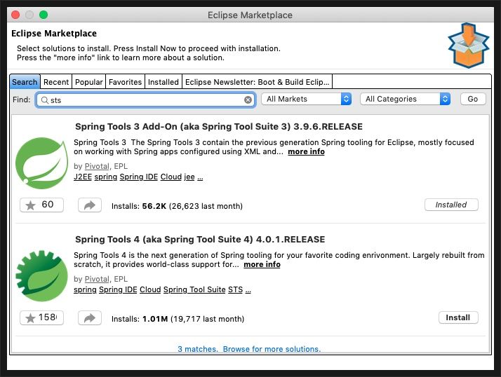 Help -> Eclipse Marketplace ... -> 검색창에 STS 검색