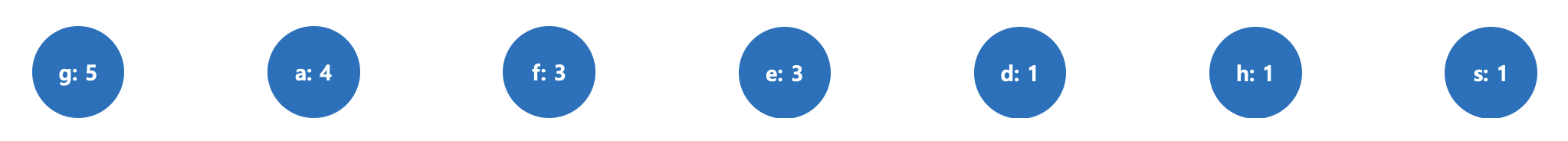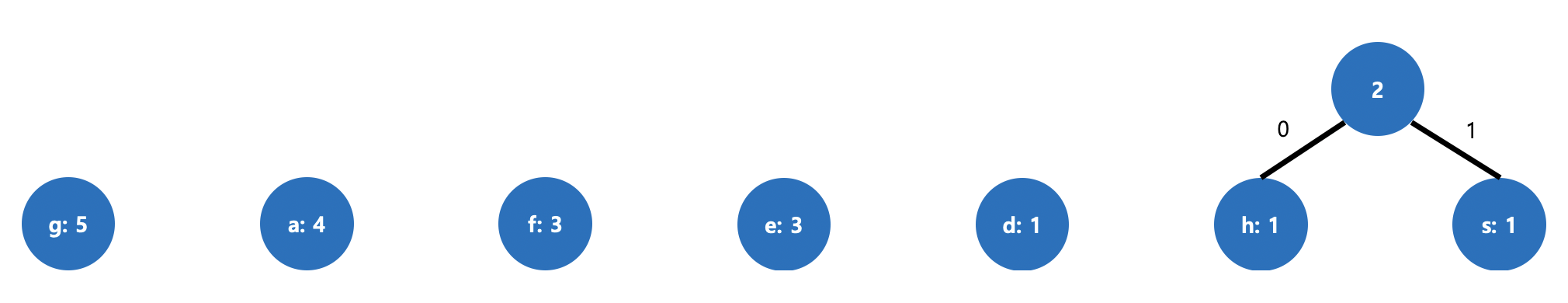 - 빈도수가 가장 작은 두 개의 노드를 선택해 부모 노드를 생성합니다. (부모 노드의 값은 각 자식 노드 값의 합)